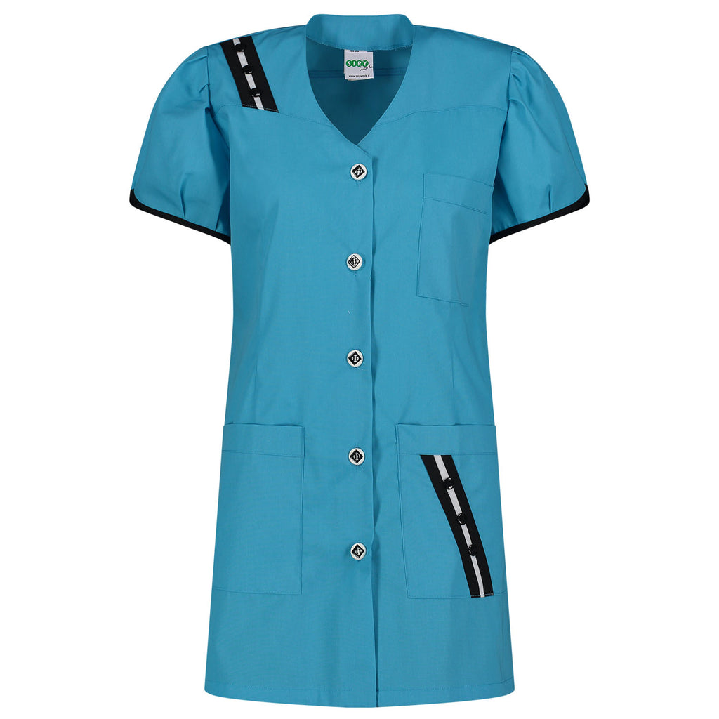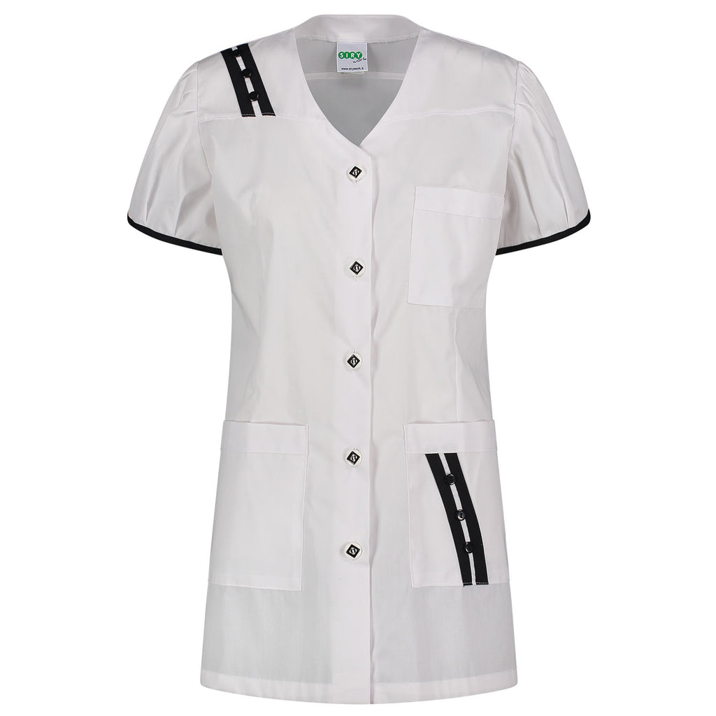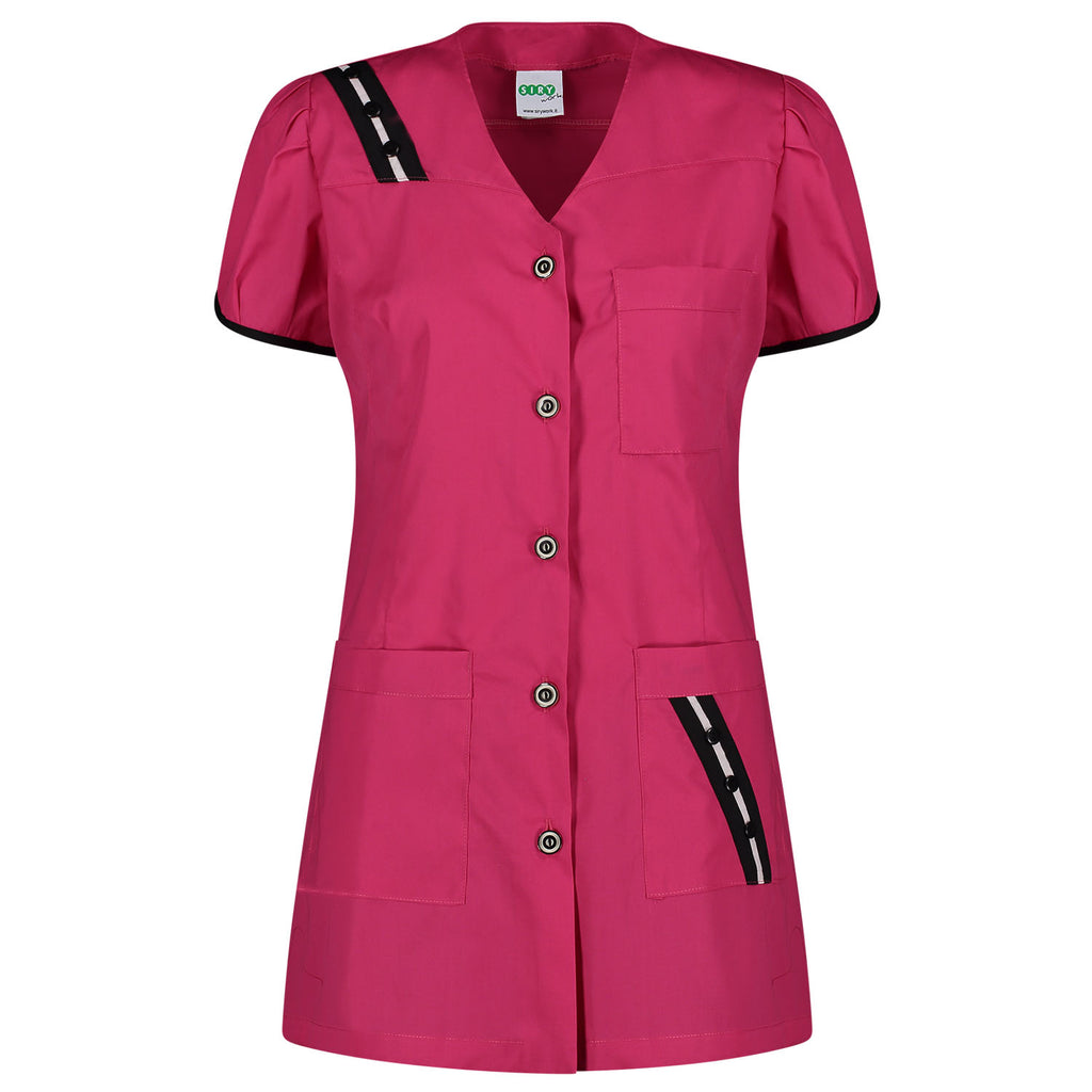 Grembiule da donna realizzato interamente in Italia dalla Siry Work, azienda specializzata nella realizzazione di capi per il settore sanitario, estetico, alberghiero, ristorazione, alimentare e dei servizi.