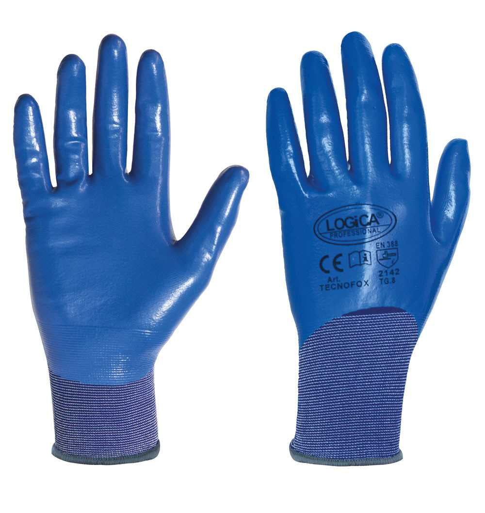 Guanti filo nylon blu lavorazione e finezza 18 aghi, spalmato nitrile. Massima sensibilità. Totalmente spalmato. Leggerezza. Lavorazioni con oli. Colore: blu