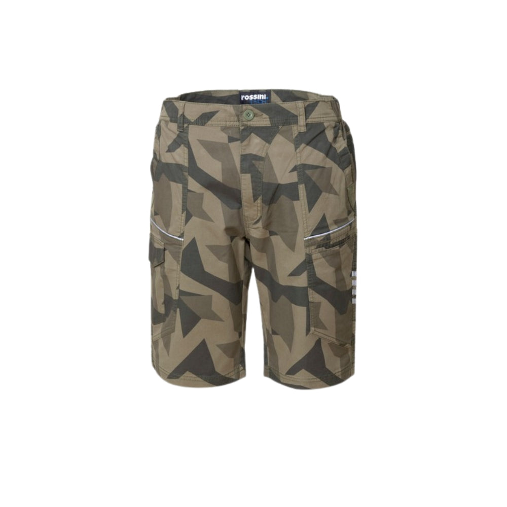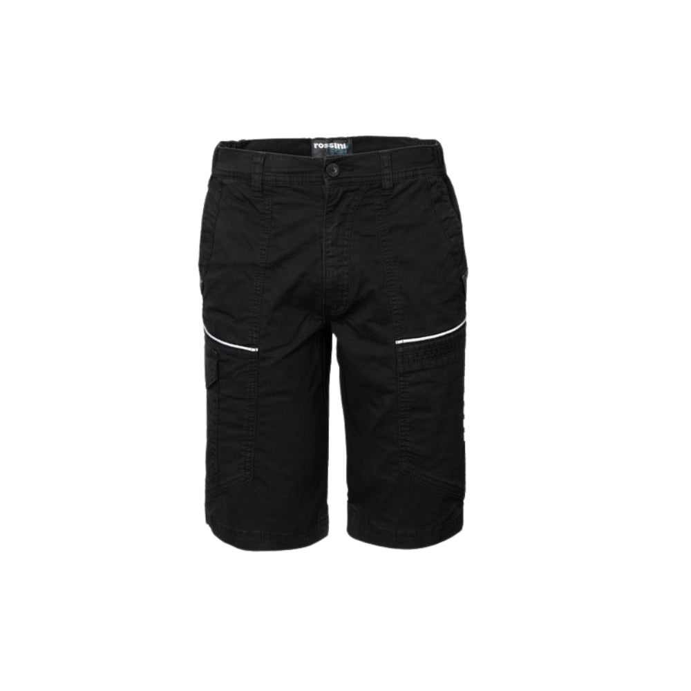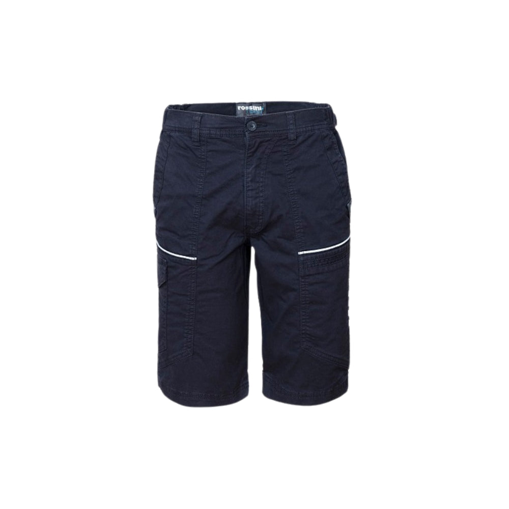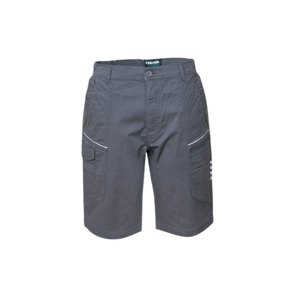 Bermuda da lavoro multitasca in cotone twill elasticizzato, con elastici laterali e passanti in vita, chiusura con zip e bottone.