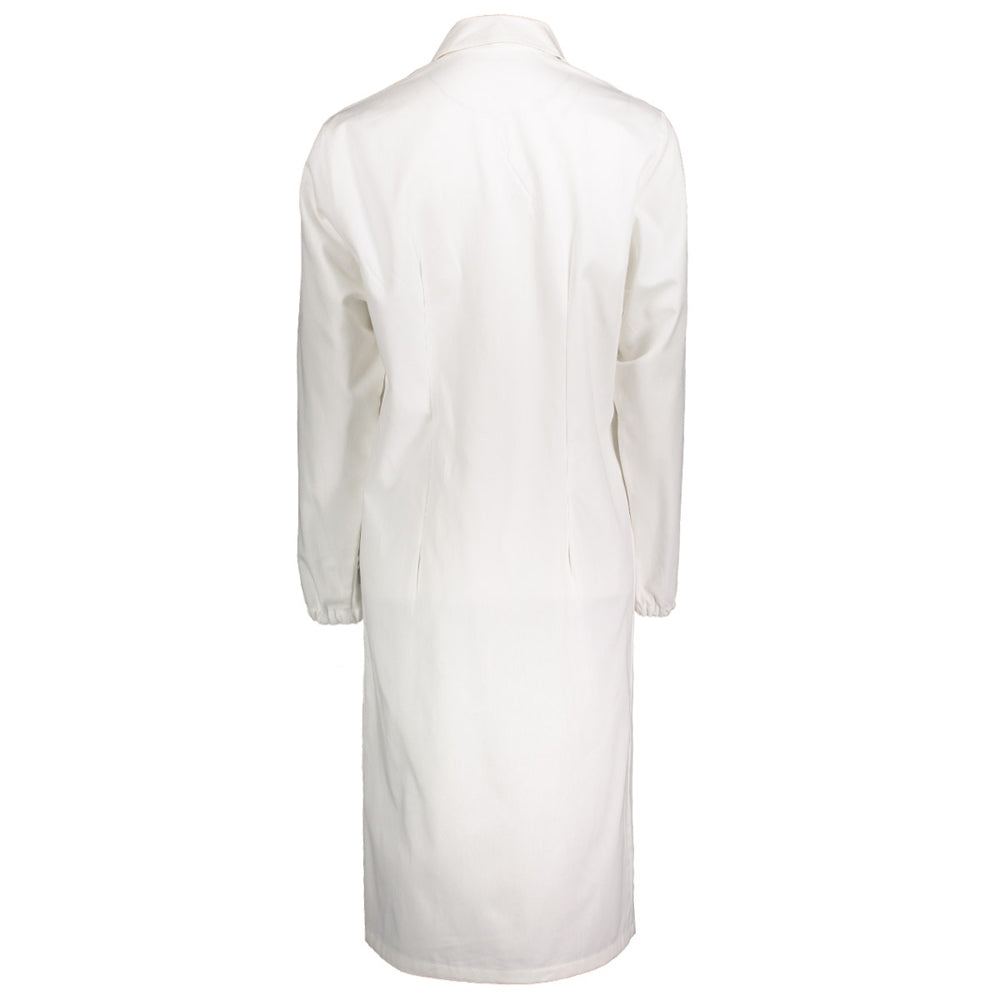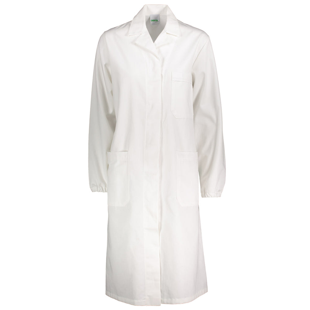 - Camice da donna per uso medico manica lunga con elastico ai polsi, chiusura alta con bottoni coperti, collo aperto, due tasche e un taschino al petto, senza martingala e lunghezza a metà ginocchio.