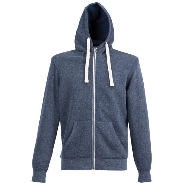 Felpa con cappuccio. Colore melange, cappuccio con cordini, colletto rialzato, zip lunga, due tasche a marsupio, nastro di rinforzo interno collo, polsini e fondo maglia in costina elasticizzata, cuciture ribattute.