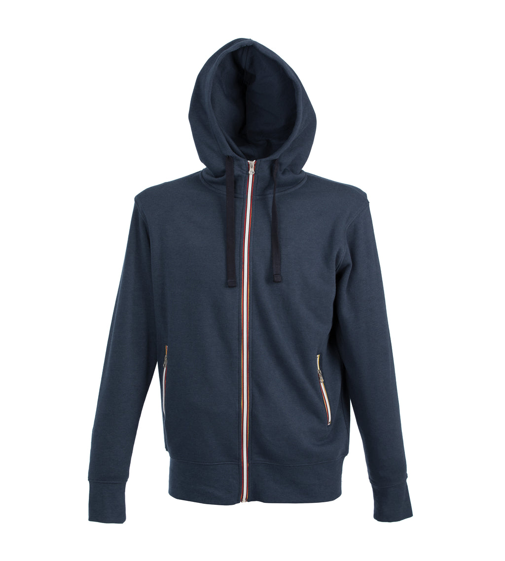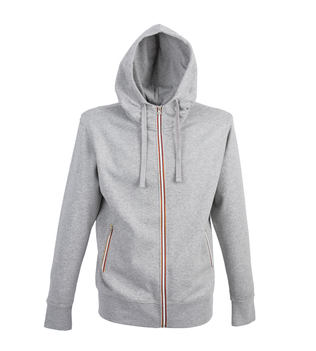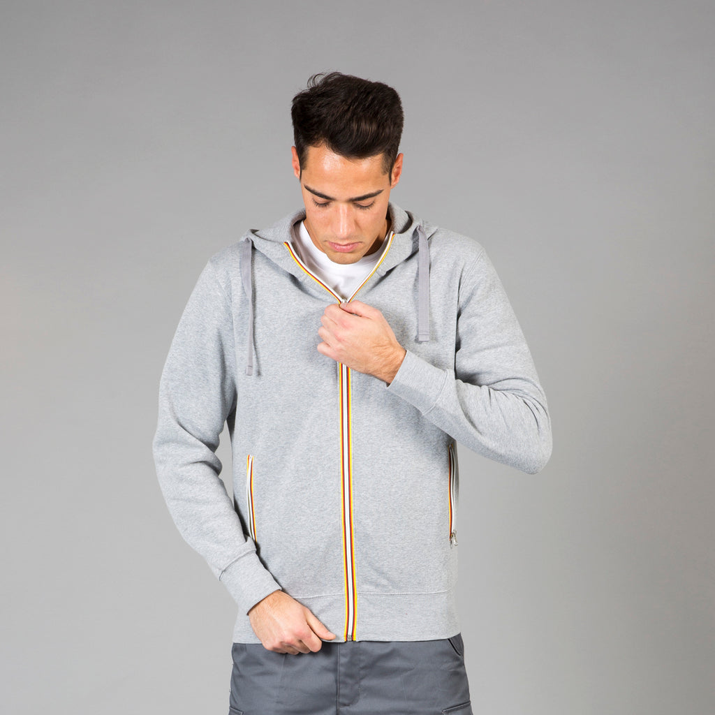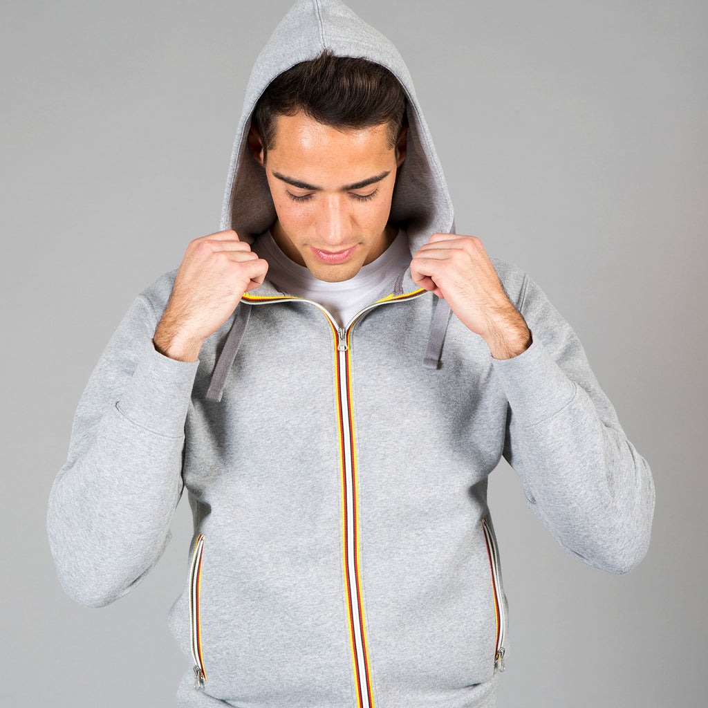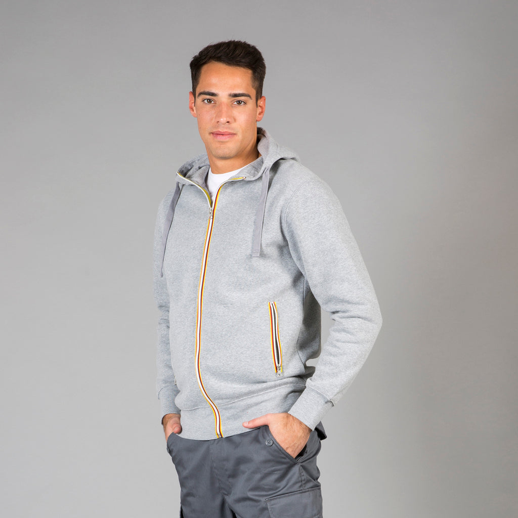 Felpa cotone – polyestere - Cappuccio foderato con cordini - Colletto rialzato - Zip lunga con tessuto giallo/rosso/nero - Due tasche con zip - Nastro di rinforzo interno collo - Polsini e fondo maglia in costina elasticizzata - Cuciture ribattute