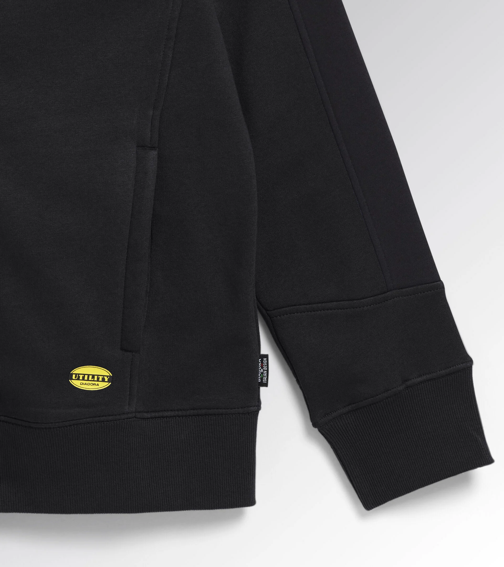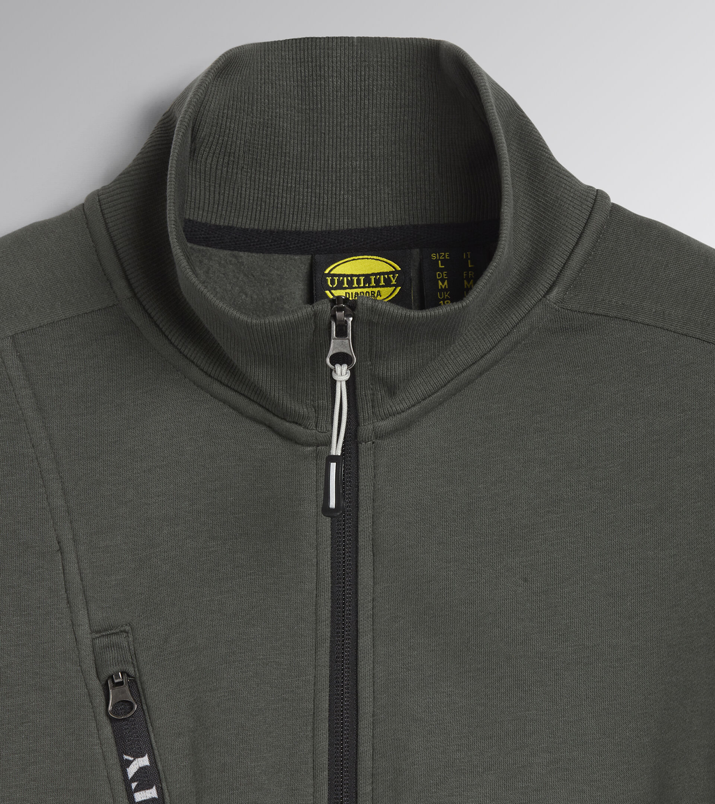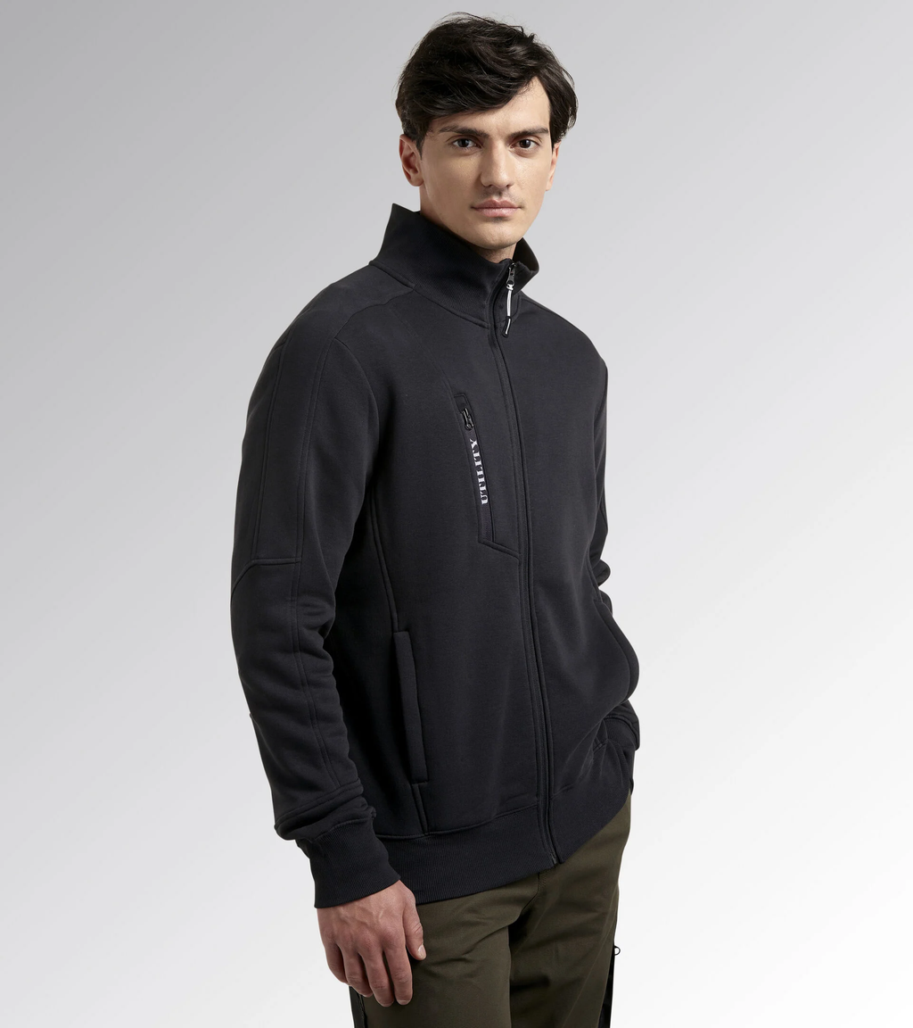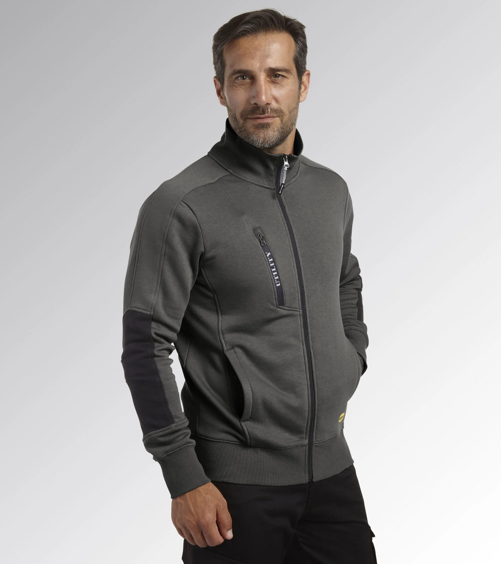 Felpa con zip garzata con inserti laterali neri su maniche e fianchi. Due tasche aperte laterali e una tasca frontale con zip. Collo, polsini e fondo in costina elasticizzata.