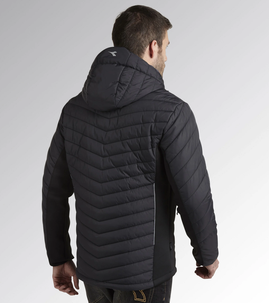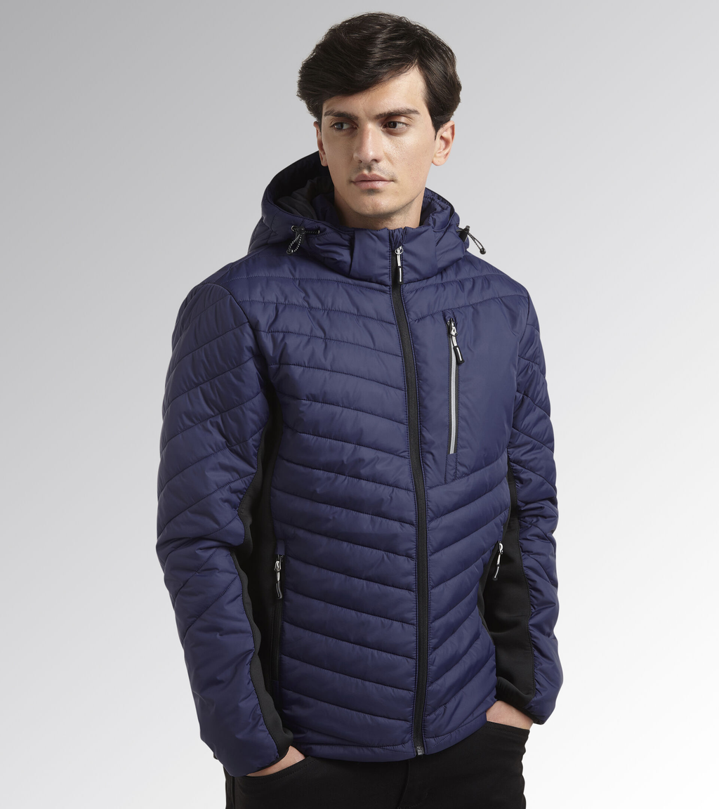 Giacca imbottita leggera, con cappuccio staccabile con frontino e doppia regolazione.