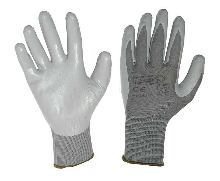 Trattasi di guanti con base in filo di Poliestere, polsino rinforzato e chiuso da doppia cucitura, spalmati in nitrile, traspirabilità sulla parte del dorso.