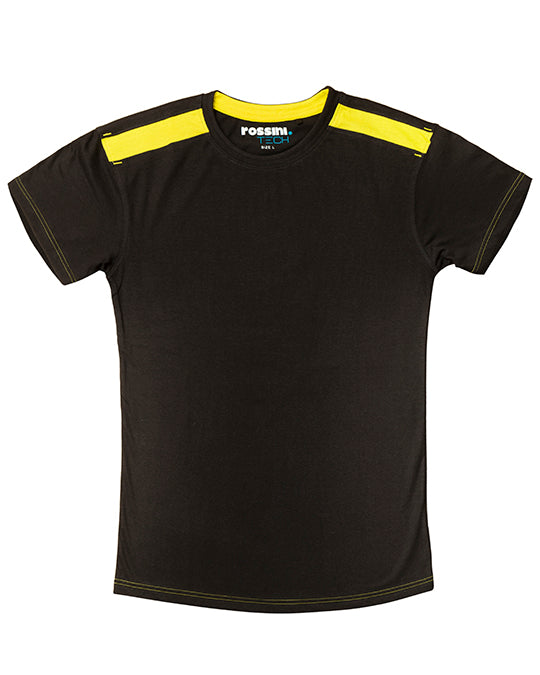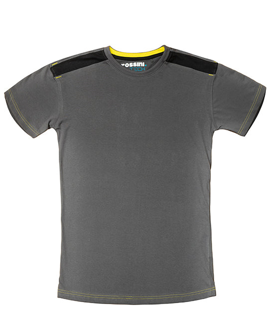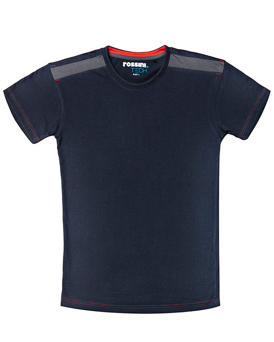 T-shirt mezza manica con fascia parasudore di colore a contrasto nella parte posteriore del collo, girocollo in maglina con doppio tessuto e parte interna di colore a contrasto, doppia cucitura di colore a contrasto al giromanica e al fondo, inserti e travette a contrasto sulle spalle.