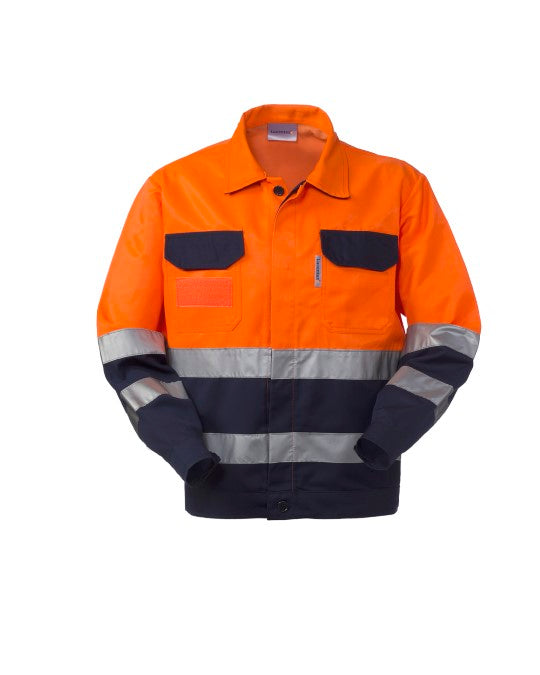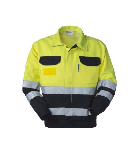 Giubbetto alta visibiltà bicolore con chiusura anteriore con bottoni coperti, collo a camicia, 2 taschini applicati al petto chiusi con aletta di colore a contrasto e punto velcro, polsi chiusi con velcro, doppia banda rifrangente applicata al giro torace e al giromanica, velcro cucito su taschino destro per applicazione porta badge