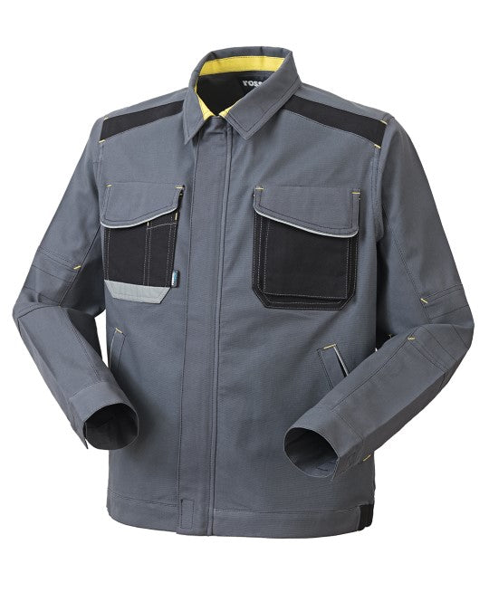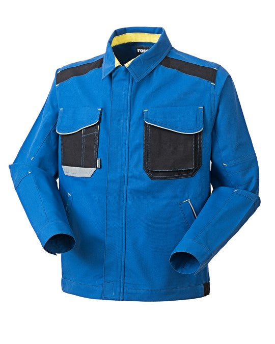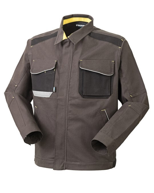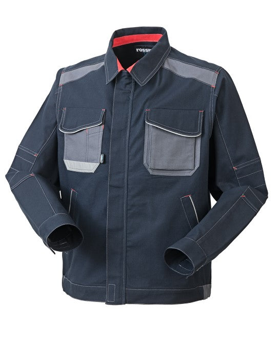 Giubbetto da lavoro multistagione in canvas stretch, chiusura centrale con cerniera in plastica coperta con punto velcro e collo a camicia, tasca al petto applicata con portapenne chiusa con aletta e velcro ed inserto rifrangente, tasca al petto applicata con patella removibile per facilitare il ricamo chiusa con aletta e velcro, ampie tasche anteriori con taglio obliquo, cuciture di rinforzo ai gomiti, polsi al fondo regolabili con velcro, doppio elastico laterale in vita, inserti e travette a contrasto.