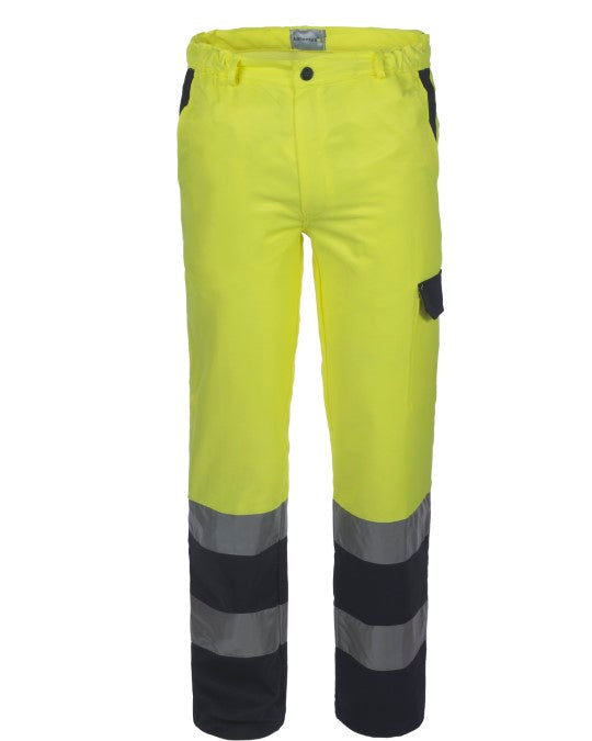 Pantalone alta visibilità bicolore con chiusura alla patta con cerniera e bottone, 2 tasche anteriori oblique interne, 1 tascone applicato su gamba sinistra chiuso con aletta di colore a contrasto e punto velcro, 1 tasca porta metro su gamba destra, 1 tasca posteriore chiusa con aletta di colore a contrasto e punto velcro applicata a destra, elastico ai fianchi, doppia banda rifrangente applicata al fondo gamba.