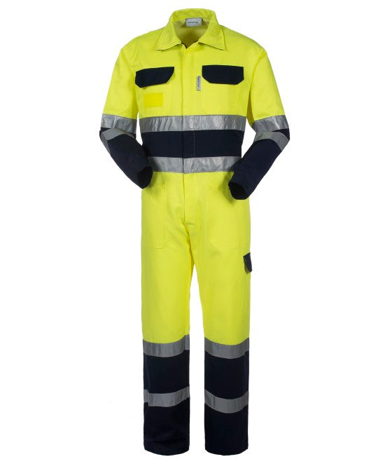Tuta alta visibilità con chiusura con cerniera centrale coperta, collo a camicia con alamaro di chiusura regolabile con velcro, 2 taschini applicati al petto chiusi con aletta di colore a contrasto e punto velcro, polsi chiusi con velcro, 2 tasche inferiori applicate, 1 tascone applicato su gamba sinistra chiuso con aletta di colore a contrasto e punto velcro, 1 tasca porta metro su gamba destra, elastico in vita posteriore, doppia banda rifrangente al giro torace, al giro manica e al fondo gamba, velcro cucito su taschino destro per applicazione porta badge.