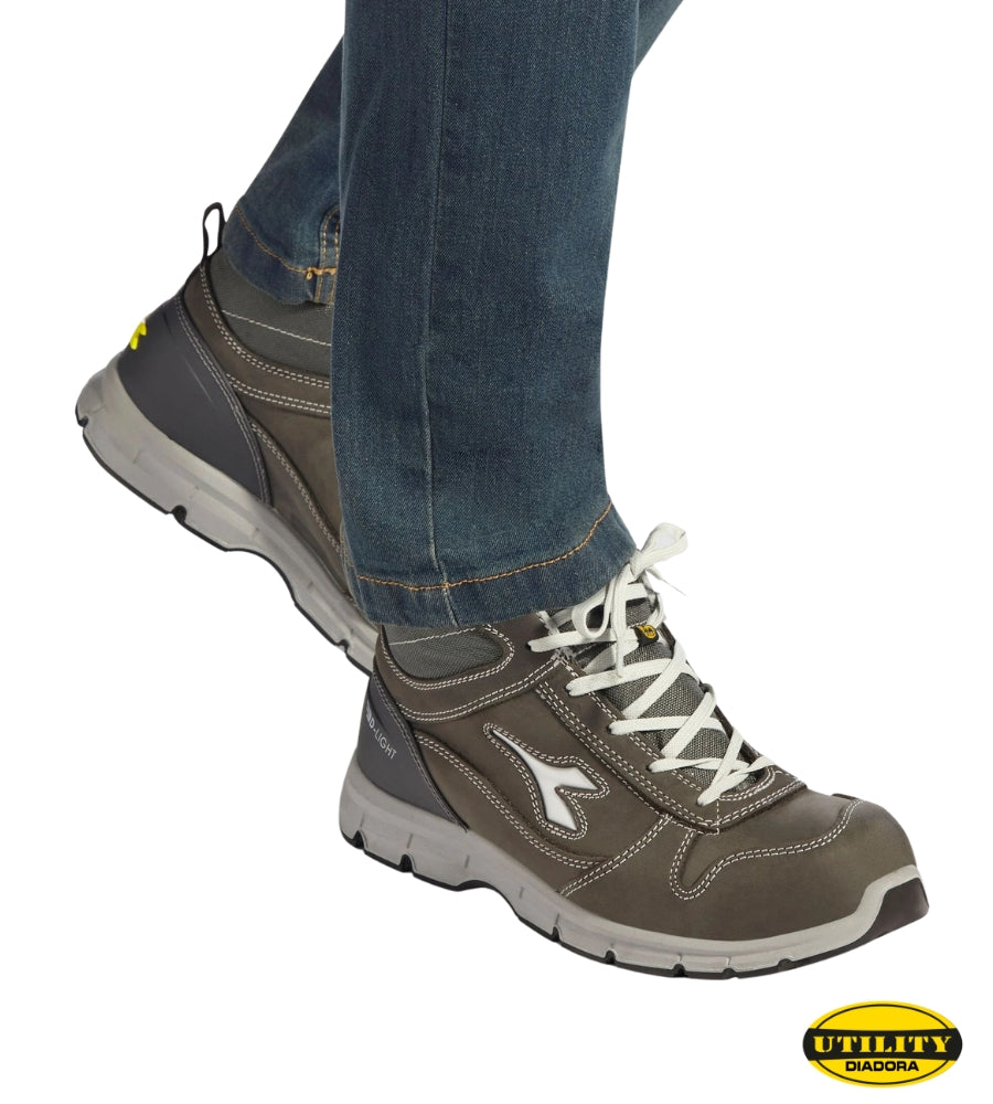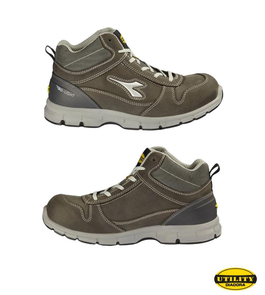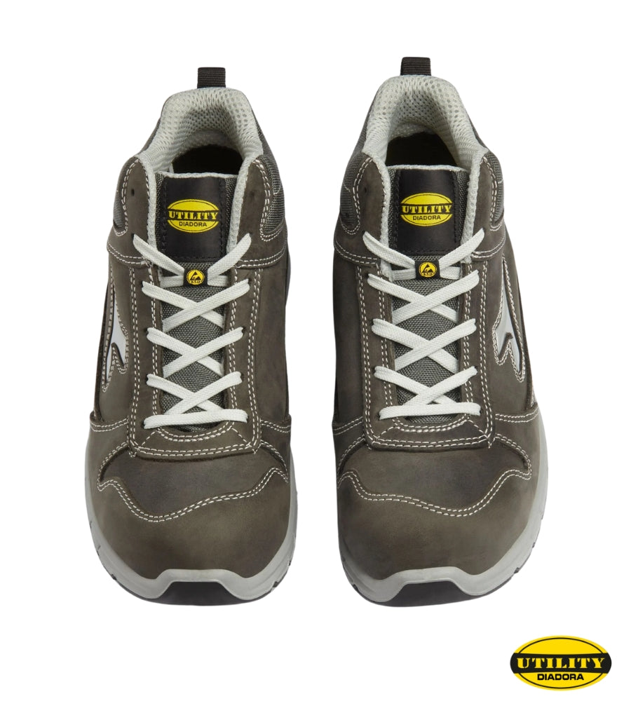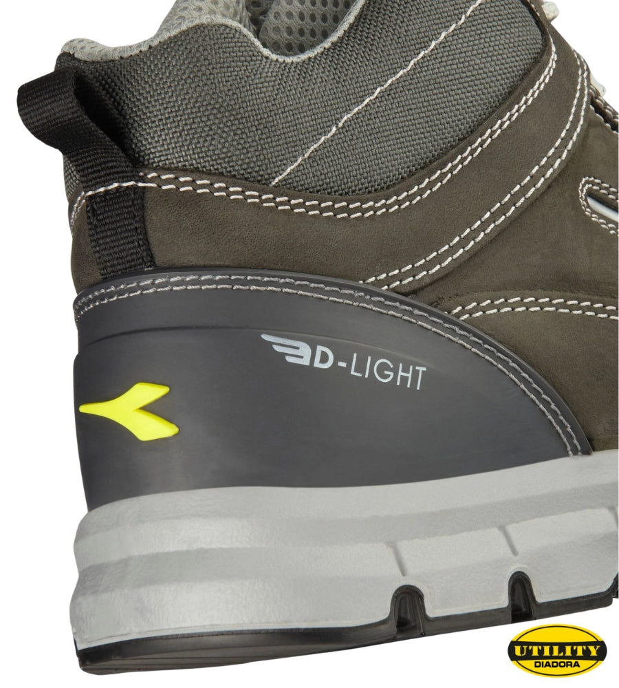 Calzatura di sicurezza mid-cut S3S idrorepellente in pelle bovina pull-up nubuck. Supporto ergonomico del tallone in TPU. Puntale in acciaio 200J. Inserto antiperforazione K-SOLE. Calzata 10. Tecnologia D-Light. Fodera in Air Mesh. Plantare anatomico microforato, antistatico estraibile in PU espanso riciclato a celle aperte, traspirante con carboni attivi. ESD.