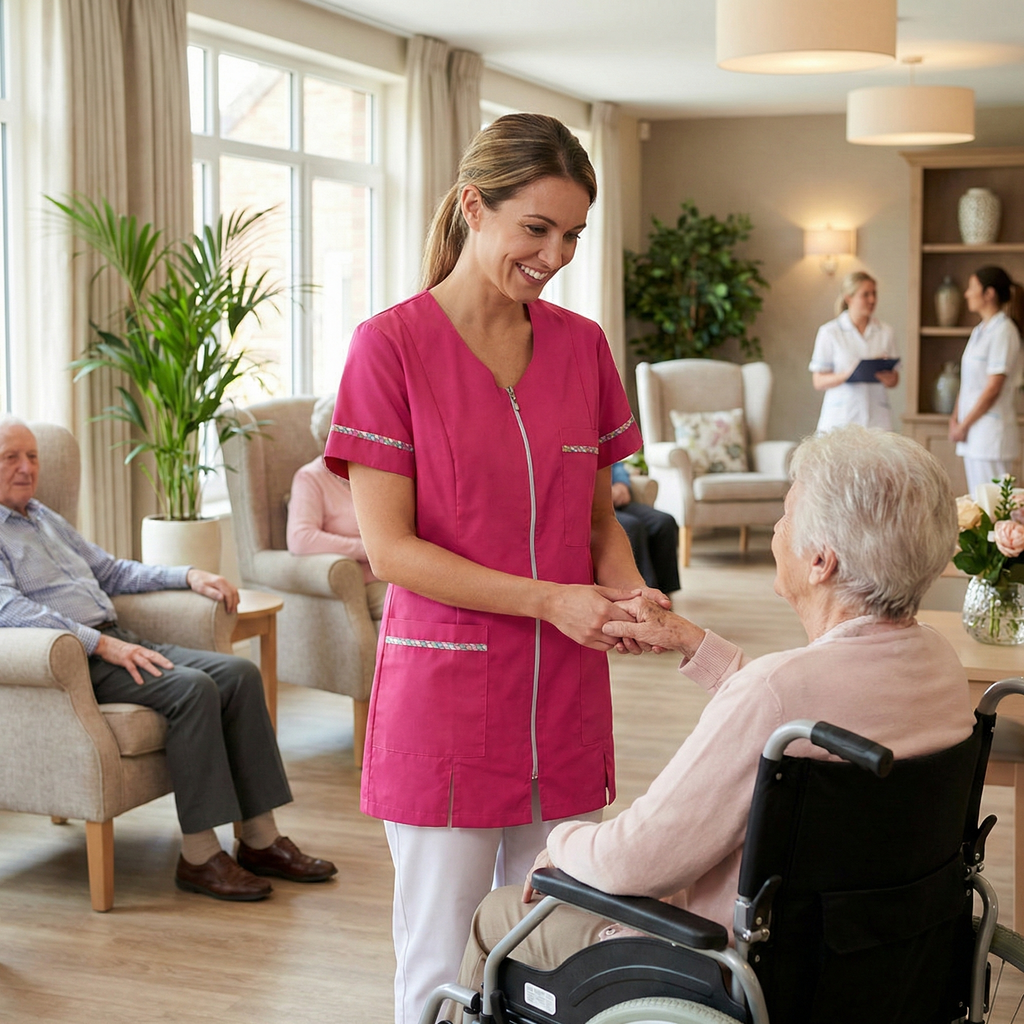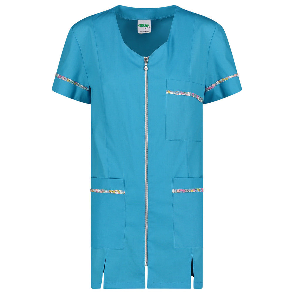 Il tessuto in misto cotone (35% cotone, 65% poliestere) garantisce massima traspirabilità, resistenza ai lavaggi frequenti e una facilità di stiratura imbattibile. I dettagli colorati sulle maniche e sulle tasche aggiungono un tocco di personalità e freschezza al tuo divisa da lavoro.