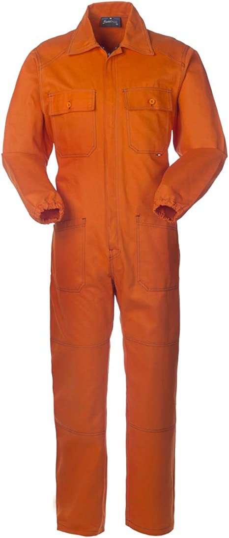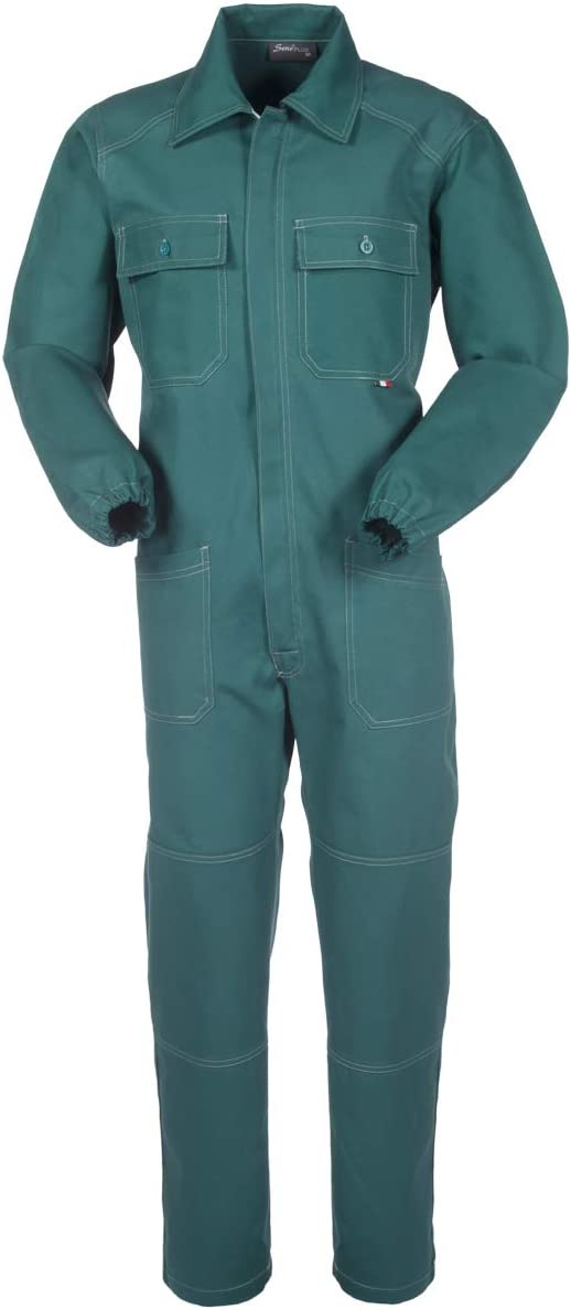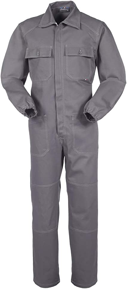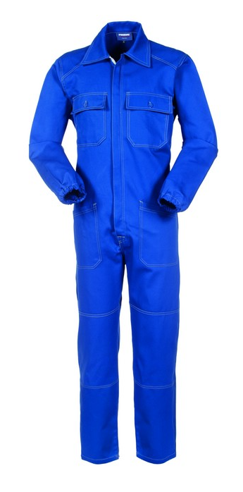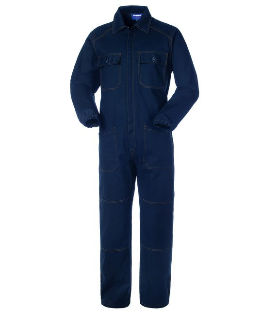 Tuta da lavoro con elastico in vita posteriore e chiusura anteriore con cerniera coperta.